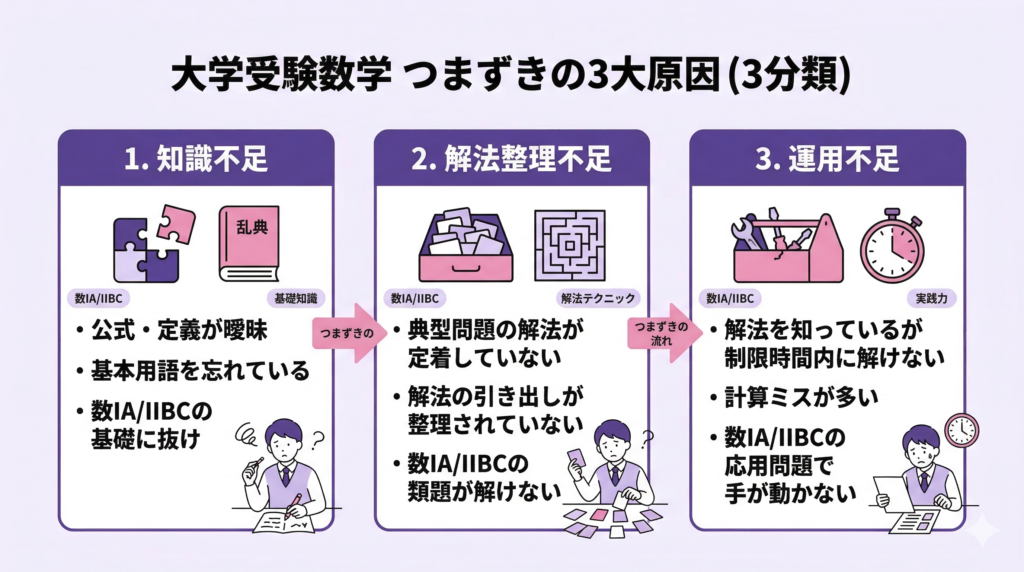 大学受験数学では、ただ演習量を増やしても伸びにくいことがあります。知識の抜けがあるのか、問題の見方が弱いのか、計算や記述の精度に課題があるのか、あるいは学習の配分が合っていないのかを見分けないまま進めると、頑張っているのに得点が安定しない状態が続きやすくなります。